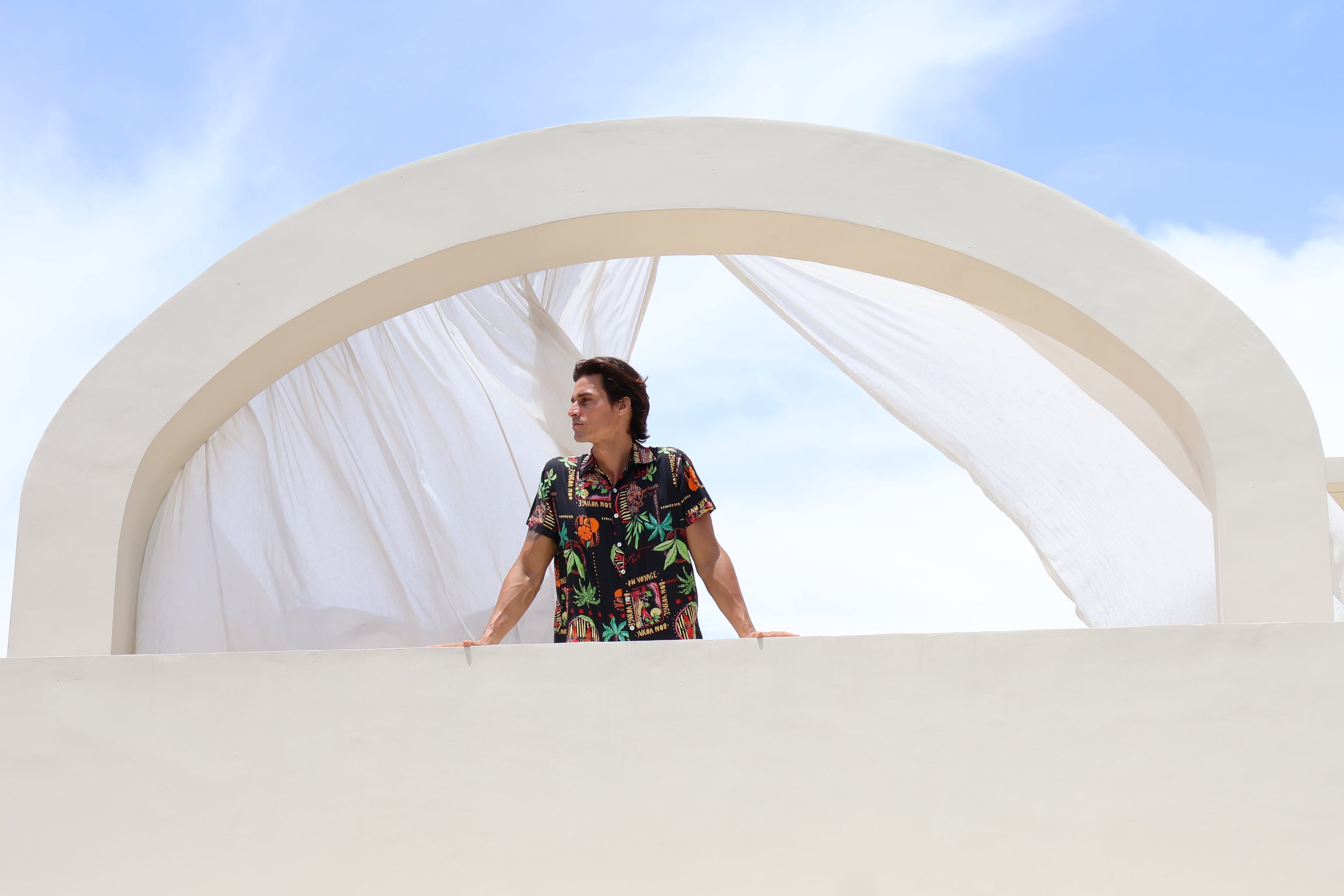 Made for warm days and easy escapes, the new Bon Voyage shirt is crafted from lightweight, breathable rayon with a soft, fluid drape. Featuring a bold, travel-inspired print on a black base, it’s designed for those who like to stand out in style. Relaxed yet refined, this is an effortless summer statement. Perfect from beachside afternoons to sunset drinks.