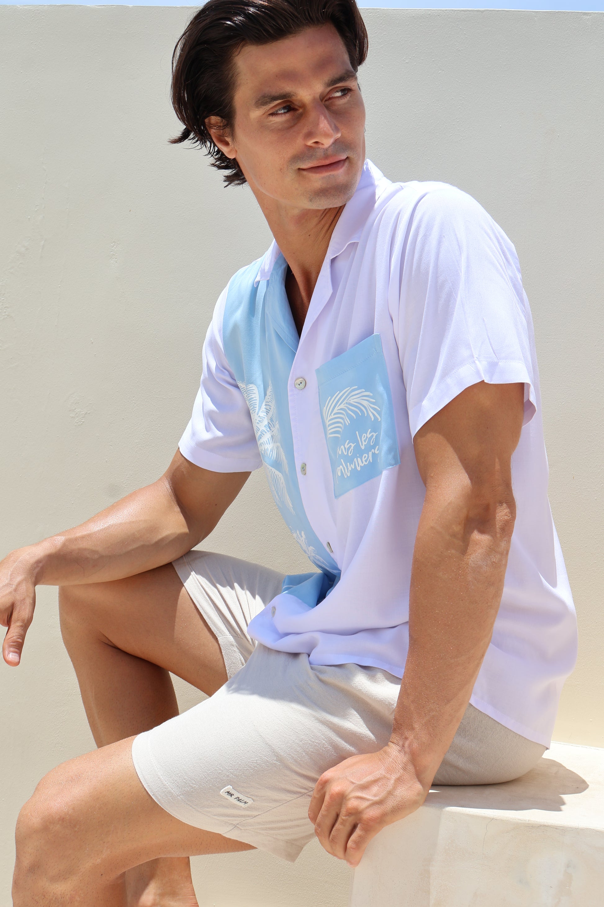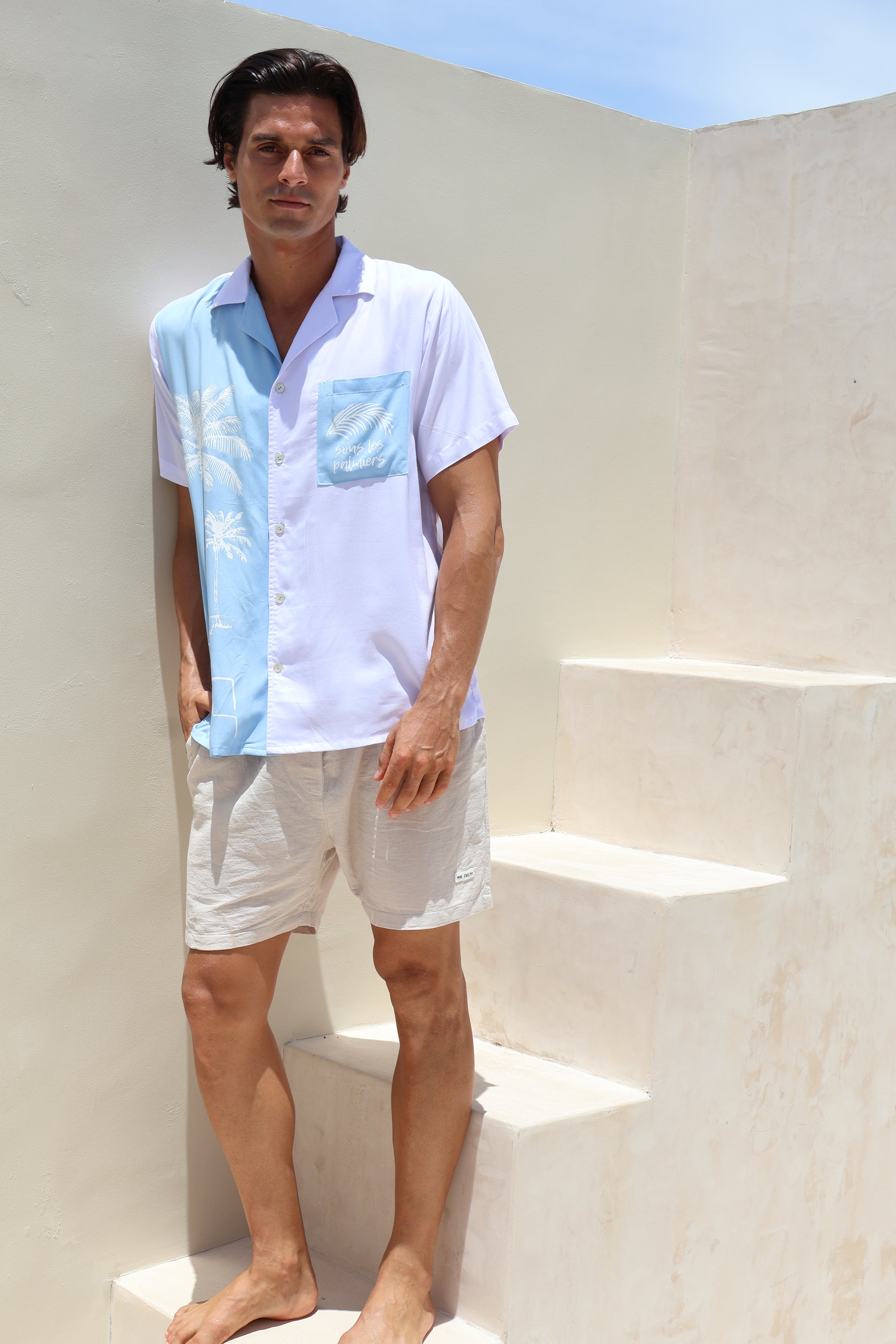 Our new 'Blue Drift' shirt is crafted from 100% lightweight rayon, delivering a smooth, breathable feel with an easy drape. The split-tone design in soft white and ocean blue captures the laid-back rhythm of seaside living, while the subtle palm print adds a refined tropical edge.